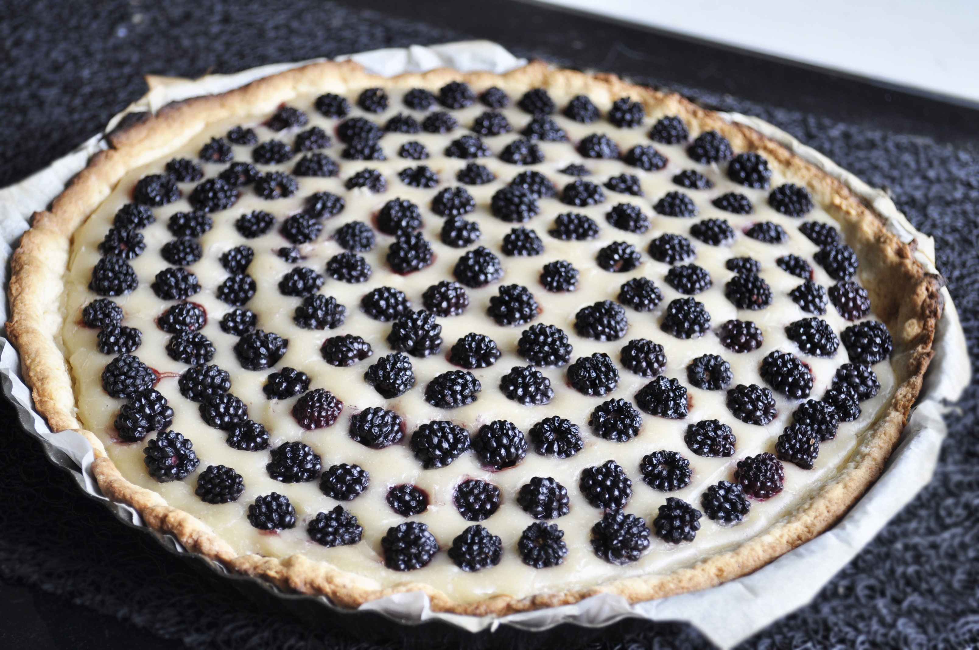 - Garnir la pâte de crème pâtissière et des fruits de votre choix et cuire 15 minutes dans un four préchauffé à 180°.