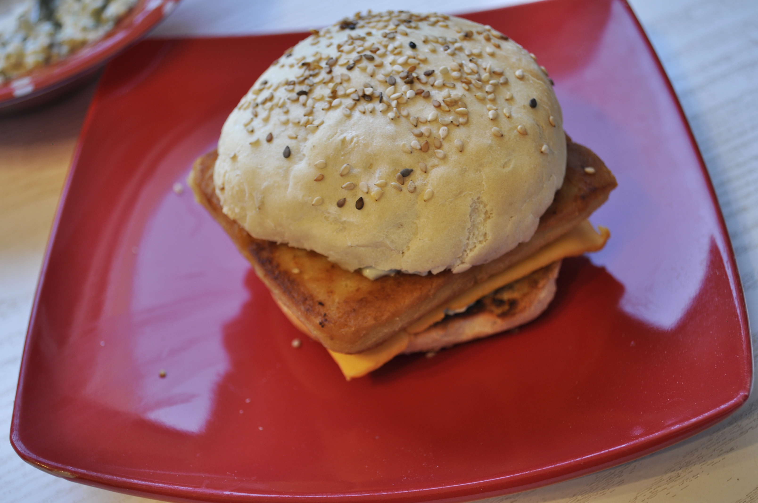 - Passer vos pains à hamburger au grille pain puis les monter de la façon suivante : une couche de sauce tartare, une tranche de cheddar végétal, votre friture de pois chiche puis une seconde couche de sauce tartare.